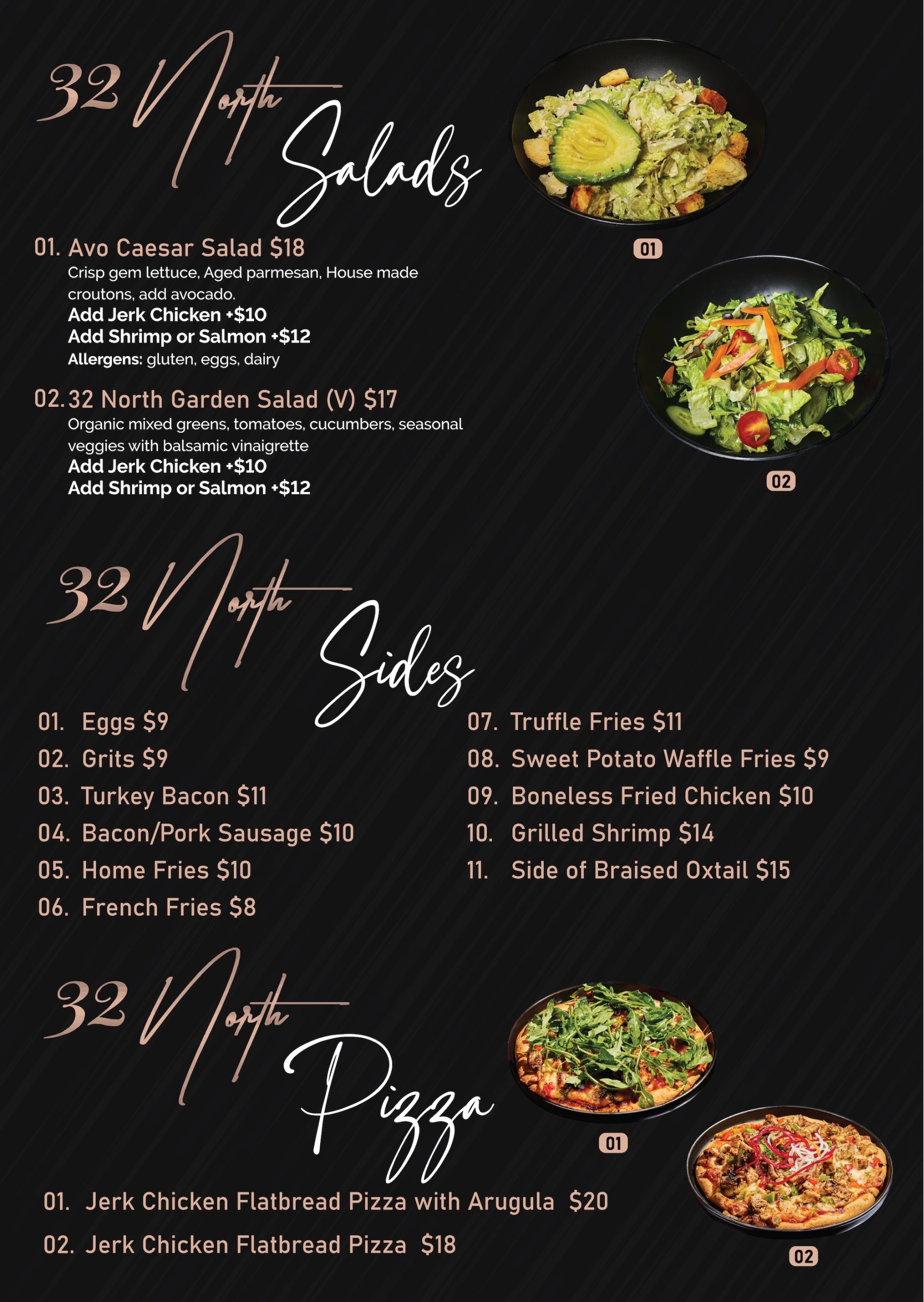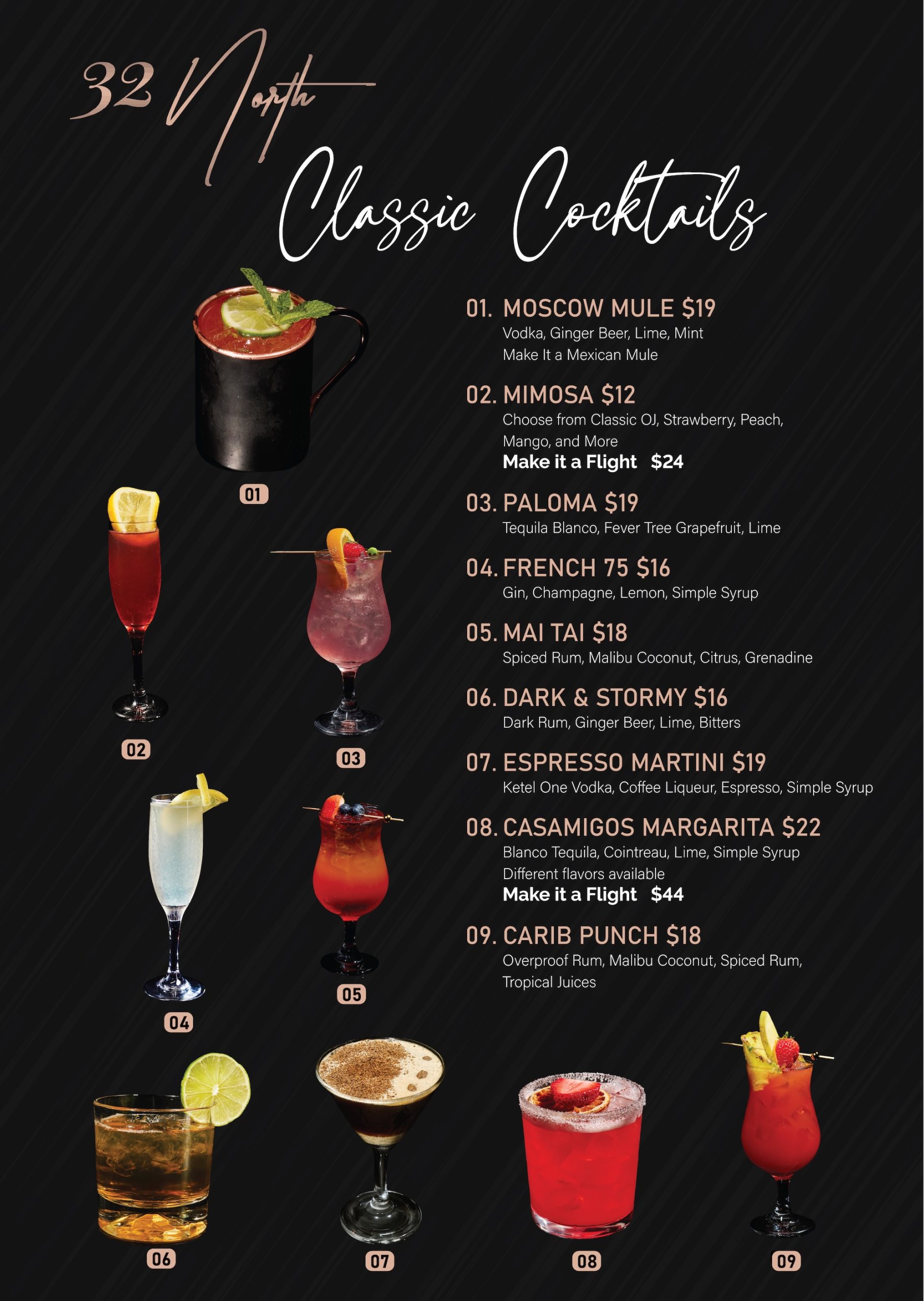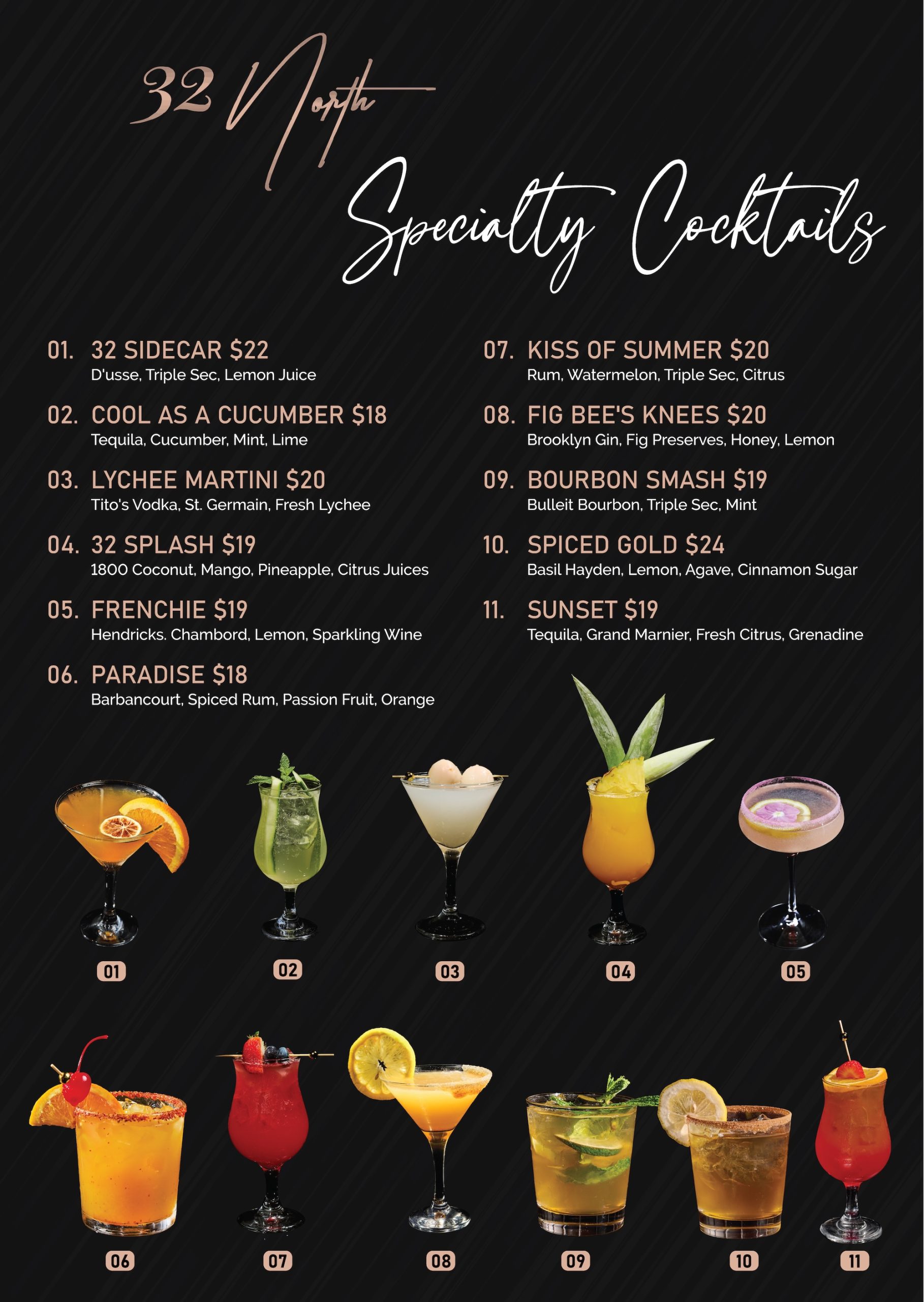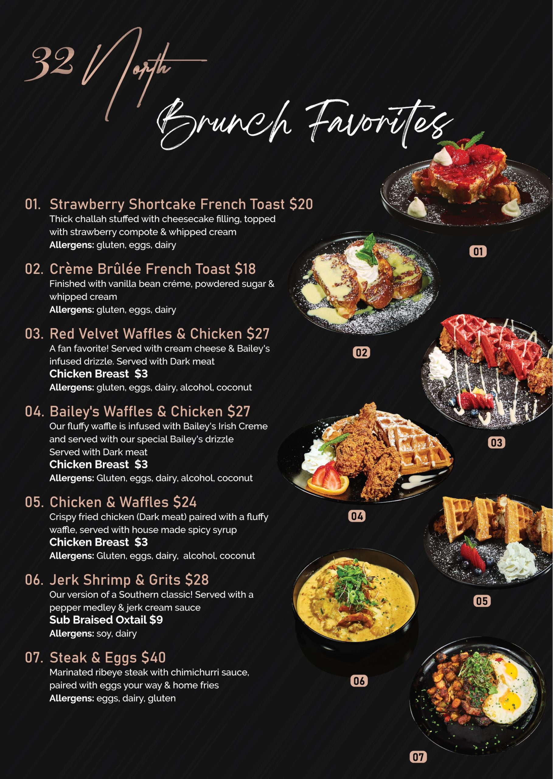 At 32 North, our menu is a celebration of flavor, quality, and creativity. From brunch classics and dinner favorites to handcrafted cocktails and refreshing mocktails, every item is thoughtfully designed to excite your senses. Whether you’re here for a leisurely brunch, an intimate dinner, or drinks with friends, you’ll find something extraordinary waiting to be discovered.