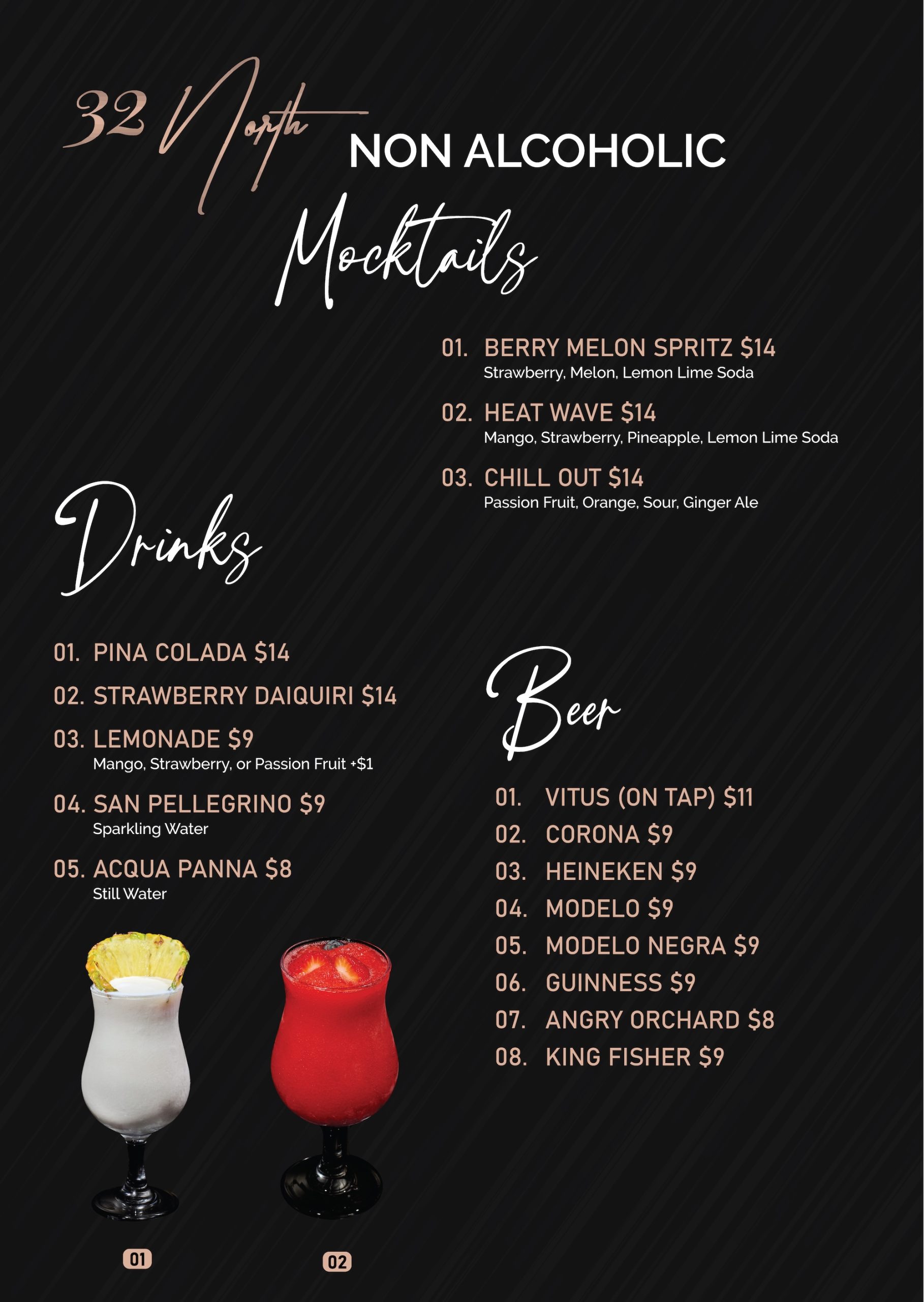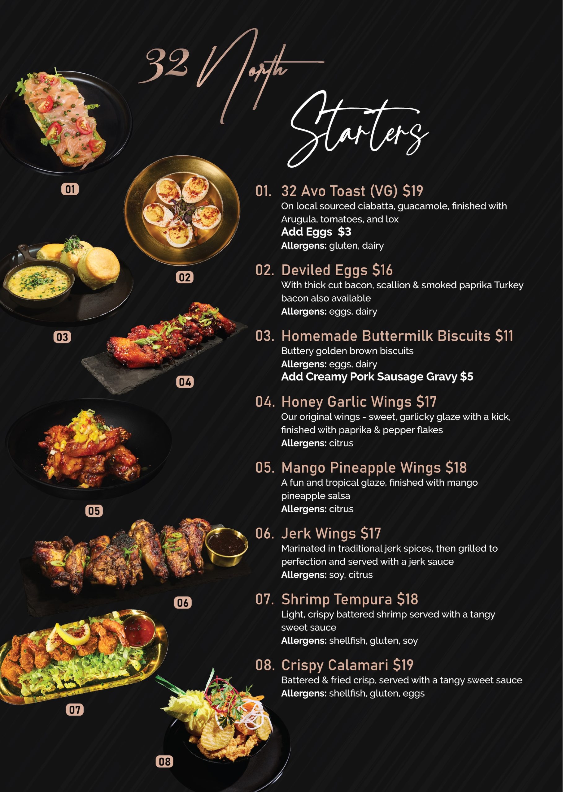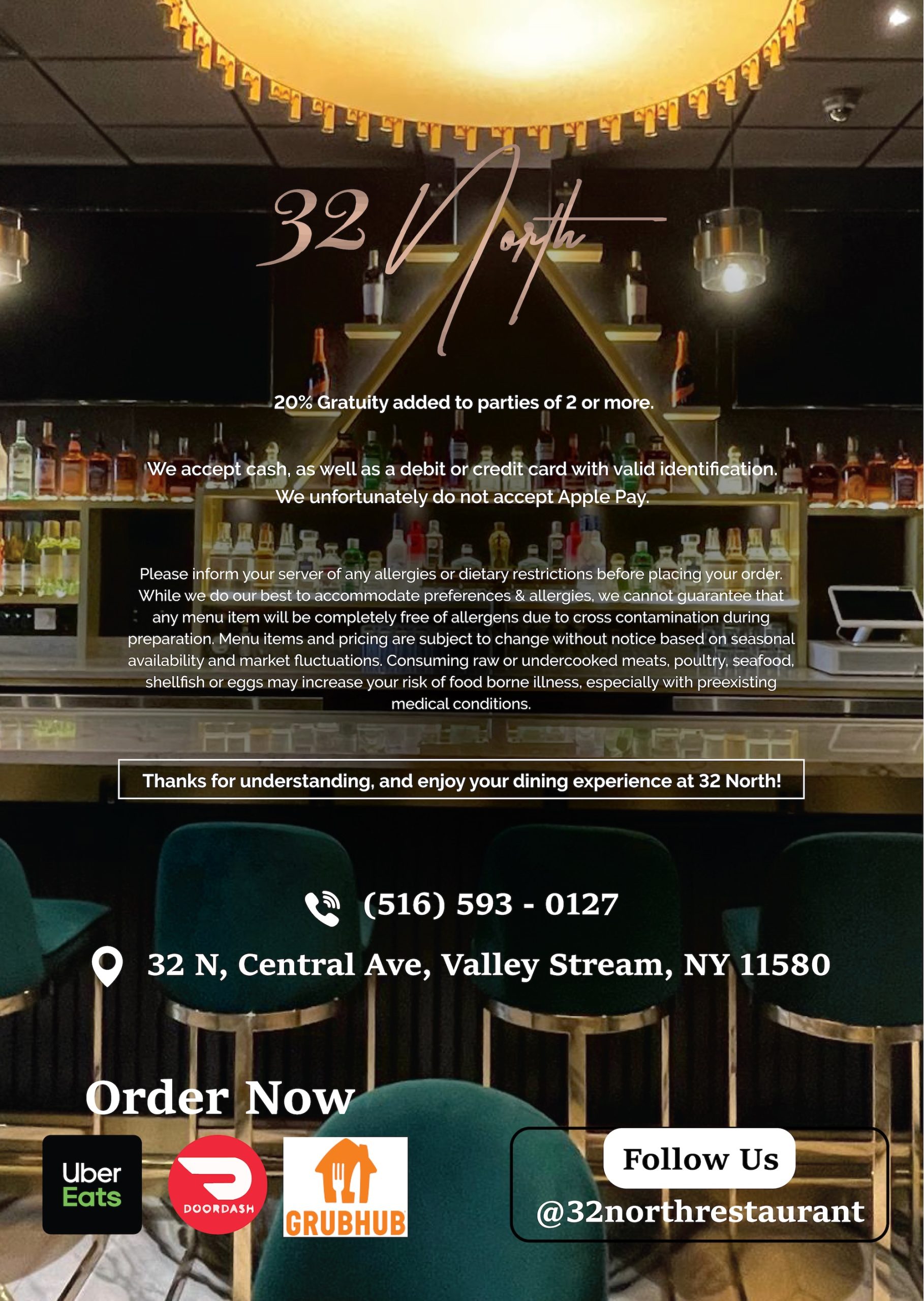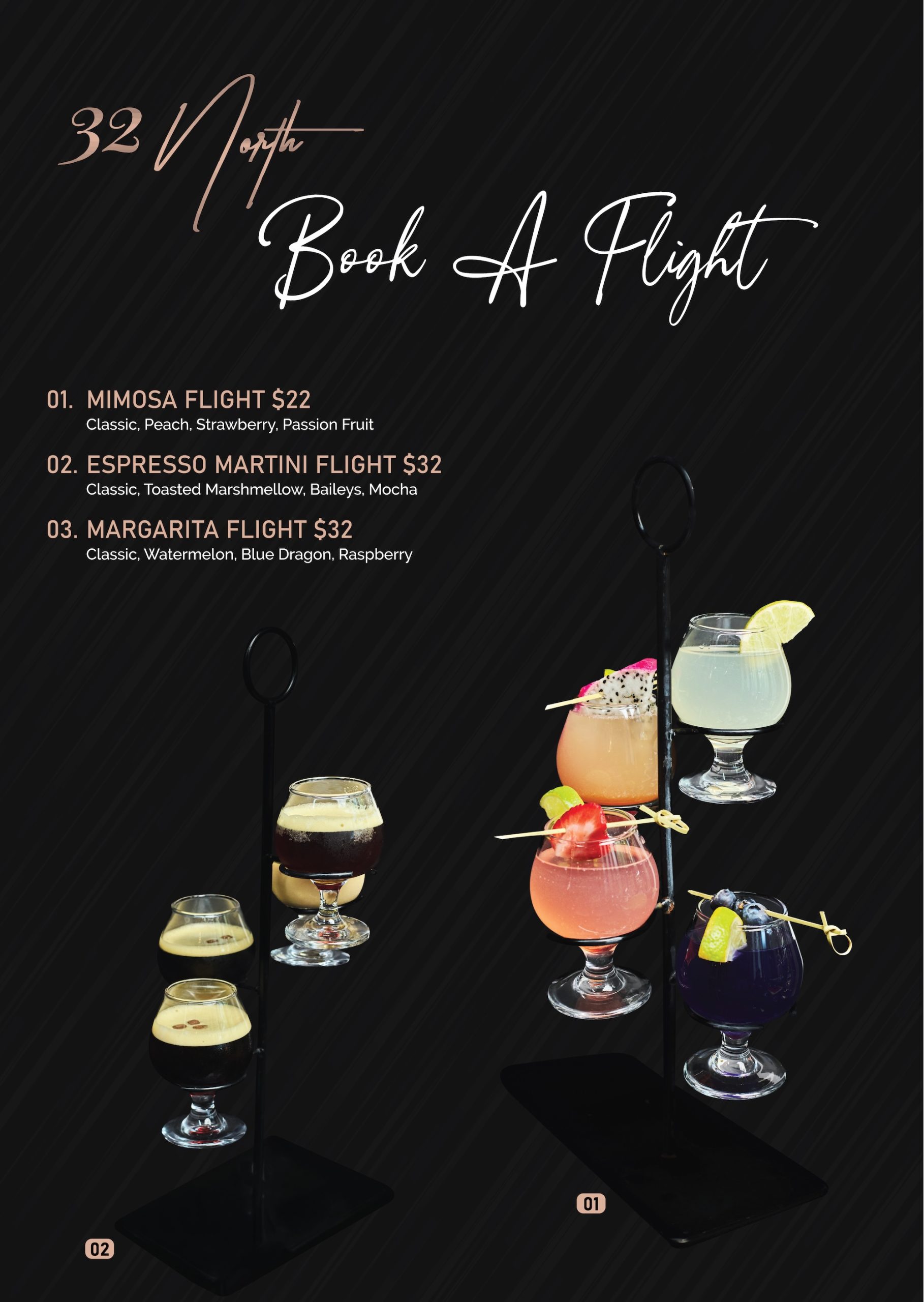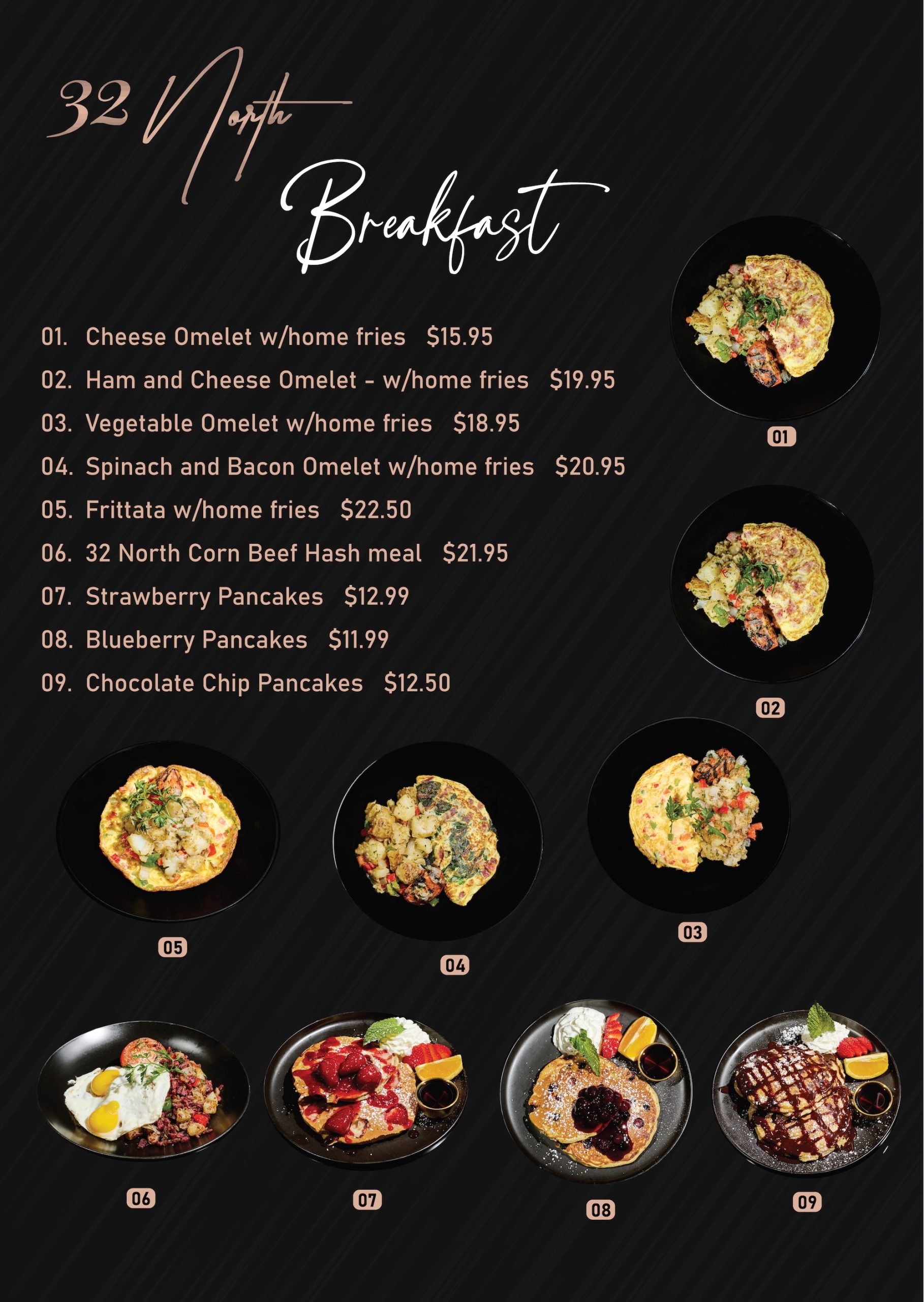 At 32 North, our menu is a celebration of flavor, quality, and creativity. From brunch classics and dinner favorites to handcrafted cocktails and refreshing mocktails, every item is thoughtfully designed to excite your senses. Whether you’re here for a leisurely brunch, an intimate dinner, or drinks with friends, you’ll find something extraordinary waiting to be discovered.